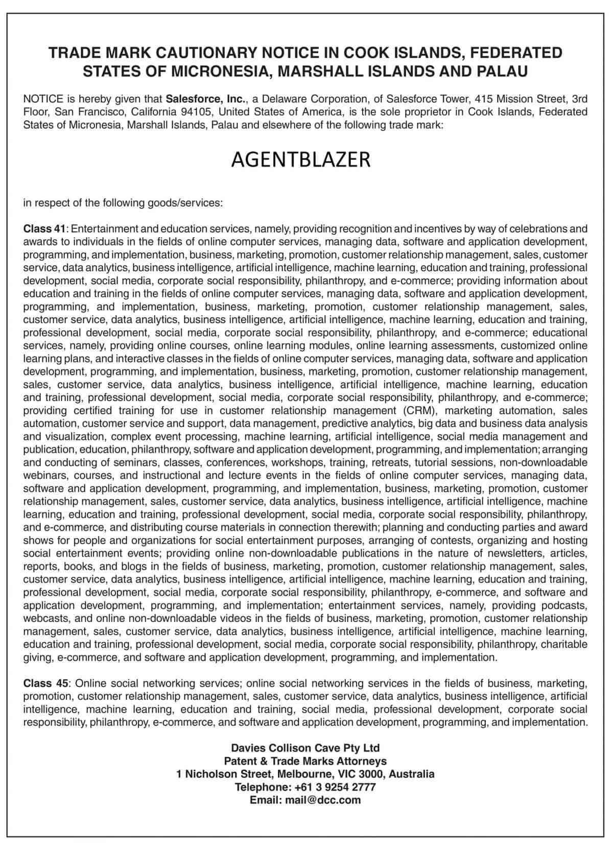 Trade Mark Cautionary Notice for AGENTBLAZER in Cook Islands, Federated States of Micronesia, Marshall Islands and Palau