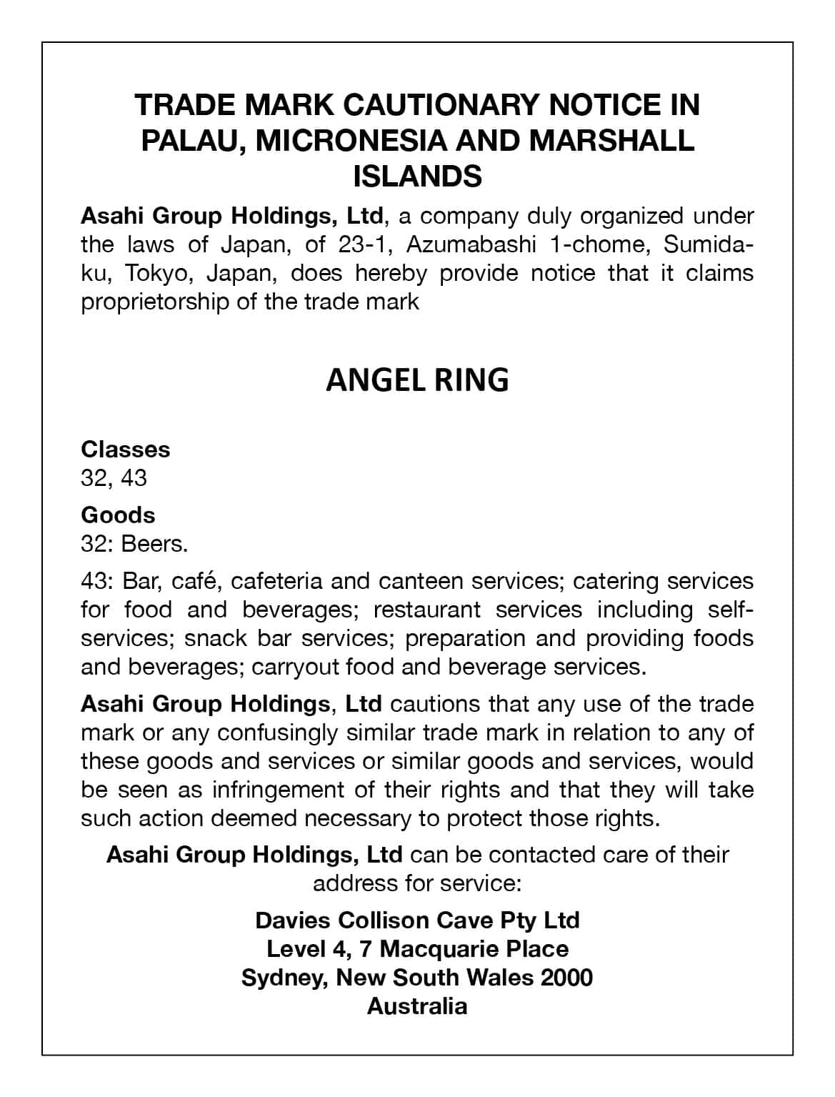 Trade Mark Cautionary Notice for ANGEL RING in Palau , Micronesia, and Marshal Islands