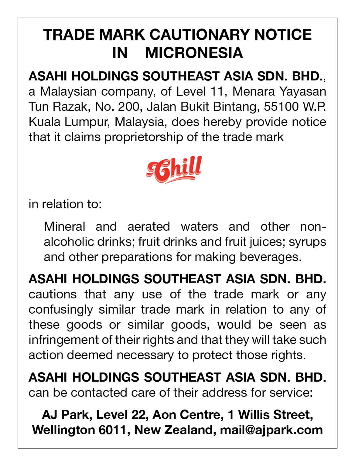 Trade Mark Cautionary Notice for Chill in Micronesia