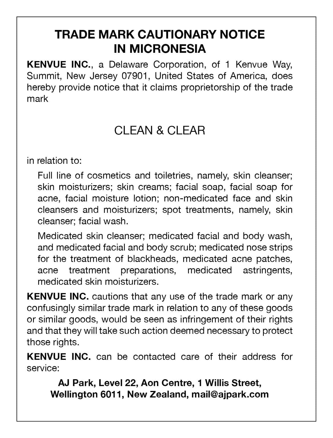 Trade Mark Cautionary Notice for CLEAN & CLEAR in Micronesia