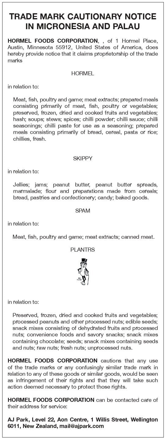 Trade Mark Cautionary Notice for HORMEL, SKIPPY, SPAM, PLANTERS and MR PEANUT logo in Micronesia and Palau