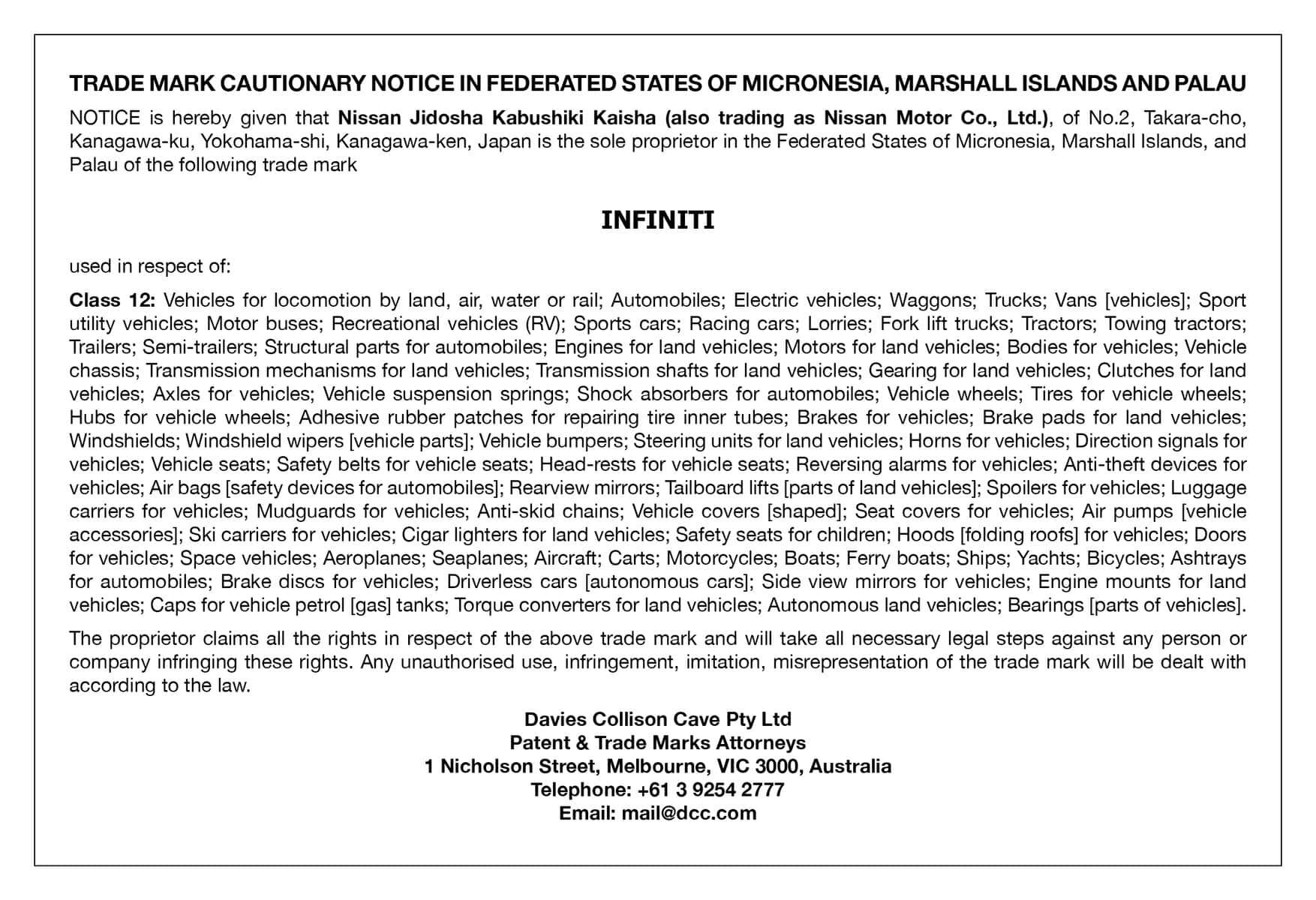 Trade Mark Cautionary Notice for INFINITI in Micronesia, Marshall Islands and Palau