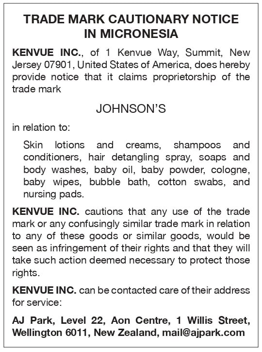 Trade Mark Cautionary Notice for JOHNSON’S in Micronesia