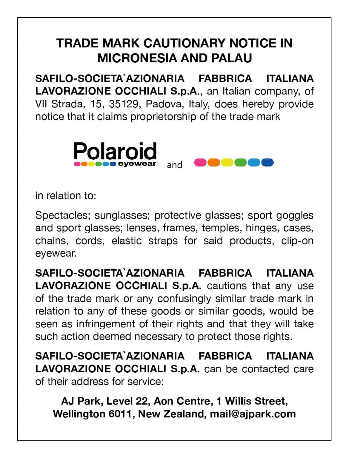 Trade Mark Cautionary Notice for POLAROID EYEWEAR logo and Dotted colour device in Micronesia and Palau