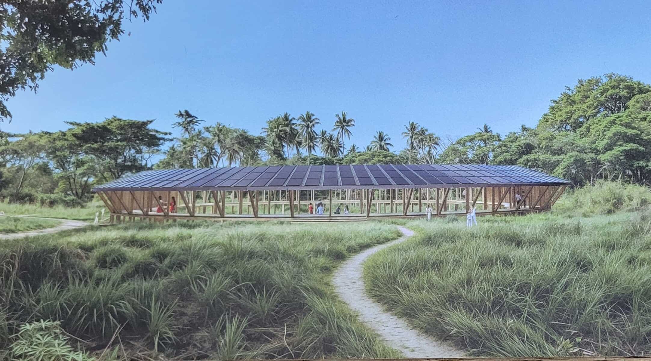 Imagine a huge pair of hands cradling a bilo (cup) lined with solar panels rising from the grasslands of a Fijian island . . .