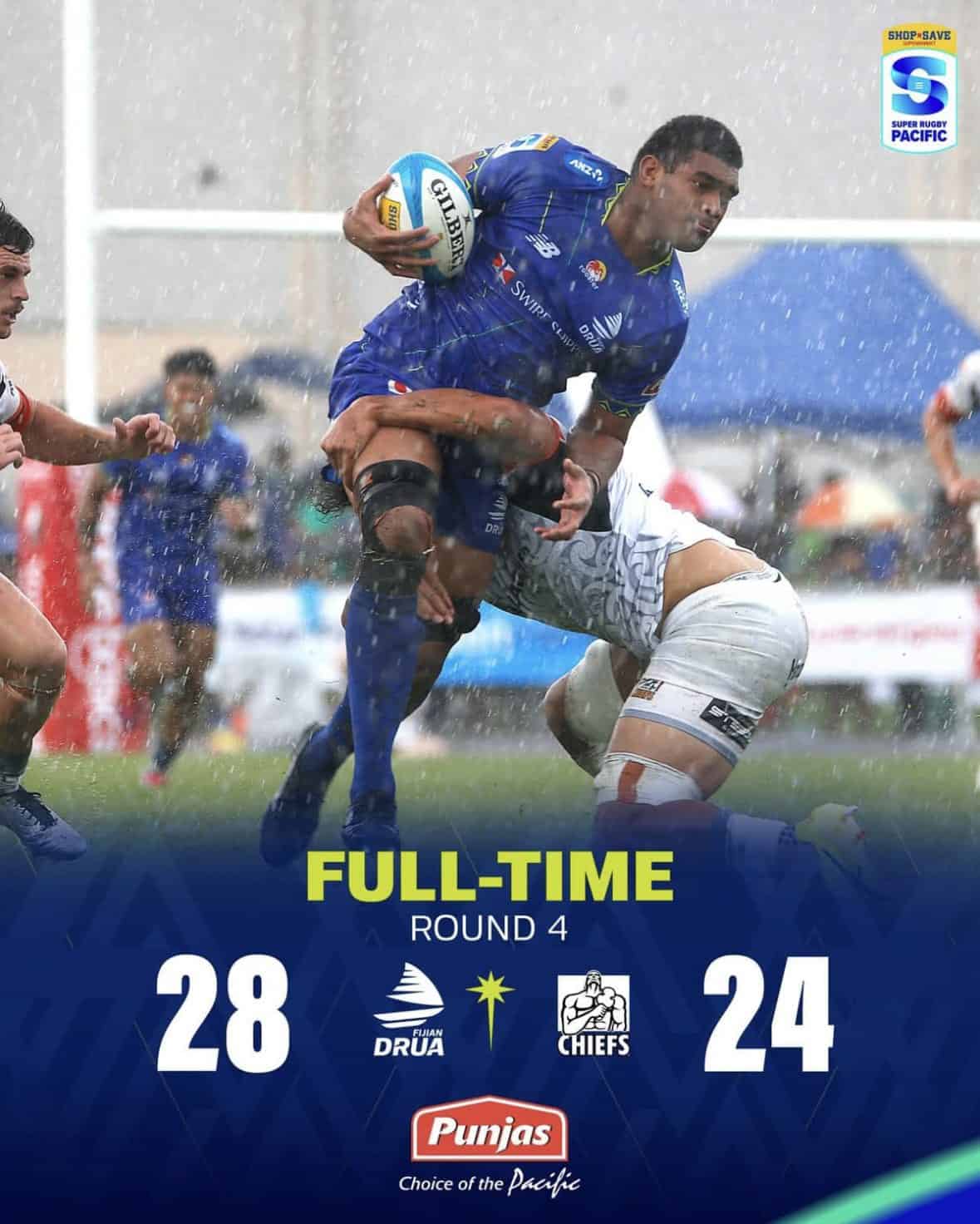 Tupou Vaa’i’s try and Jacomb’s conversion secured a bonus point for the Chiefs, but it was too little, too late, as the Drua held on for a memorable 28-24 victory.