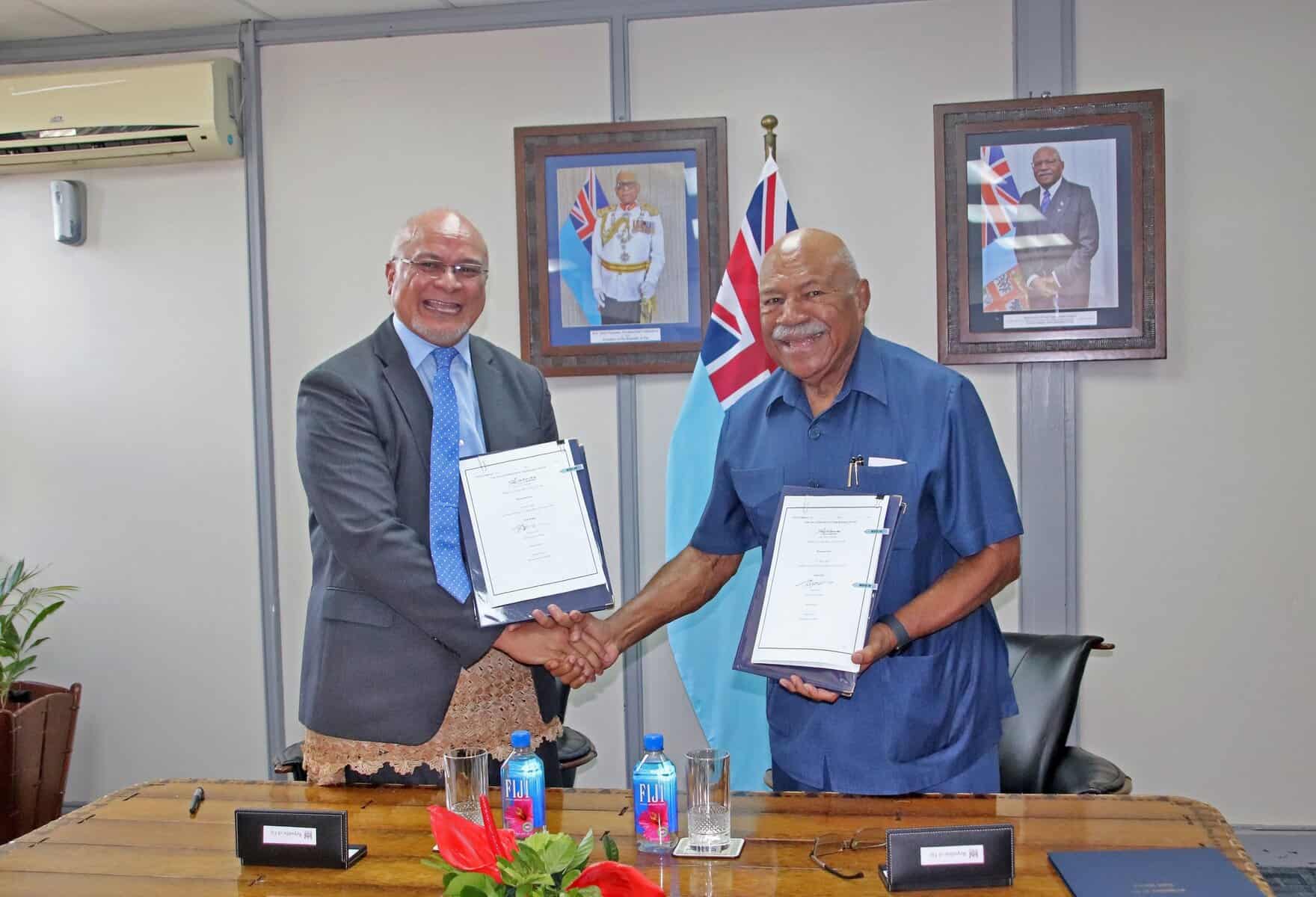 PCRIC CEO, Aholotu Palu (left) and Fiji Prime Minister, Sitiveni Rabuka (right) after the signing of the host country agreement. Image Credit: Fiji Government