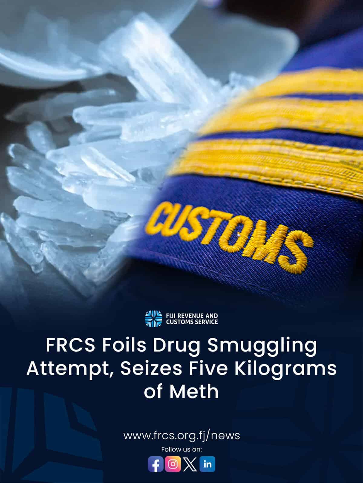 The Fiji Revenue and Customs Service (FRCS) has successfully intercepted approximately five (5) kilograms of methamphetamine at Nadi International Airport, demonstrating its steadfast resolve to combat transnational crime, secure Fiji’s borders, and protect the safety and well‑being of its communities.