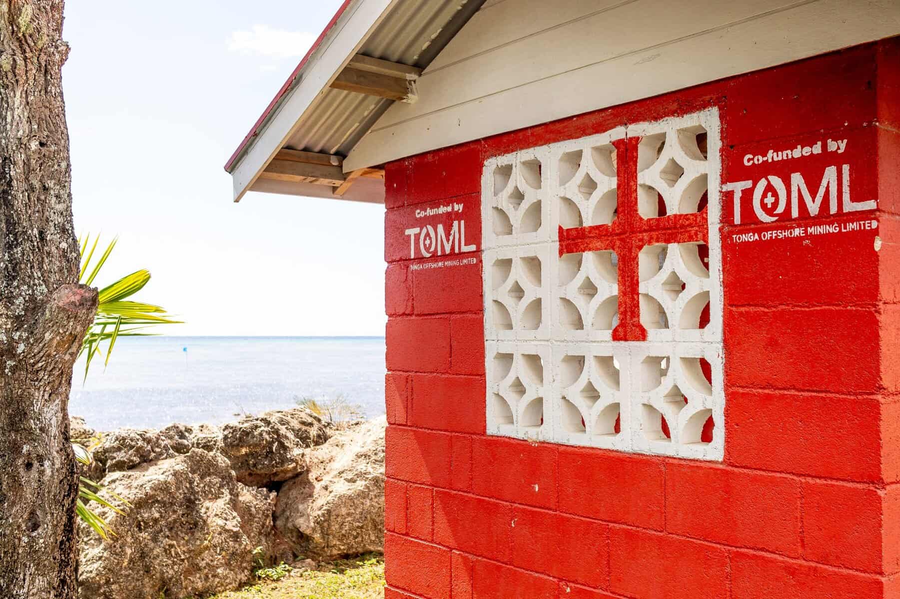 A building in Tonga shows signage indicating funding from Tonga Offshore Mining Limited (TOML). Image: PANG