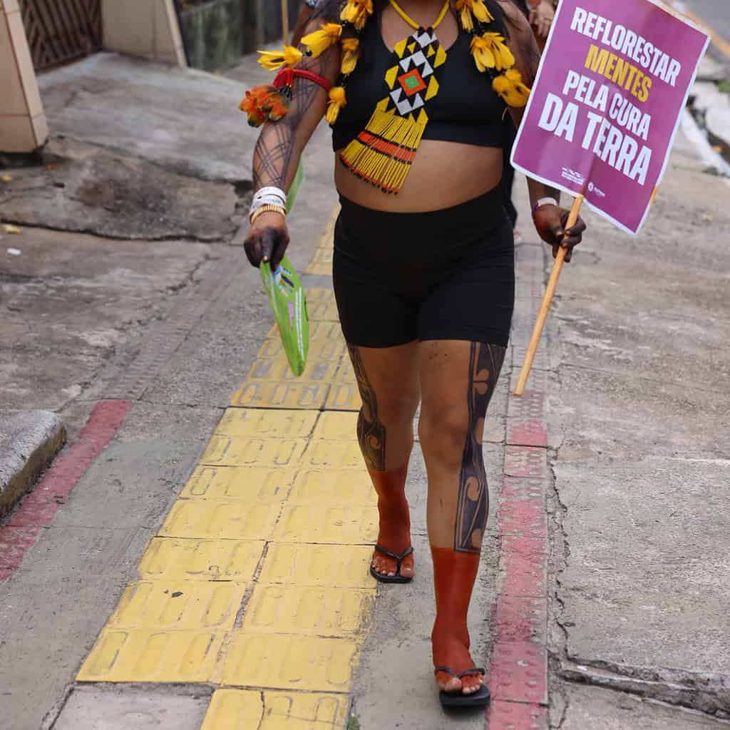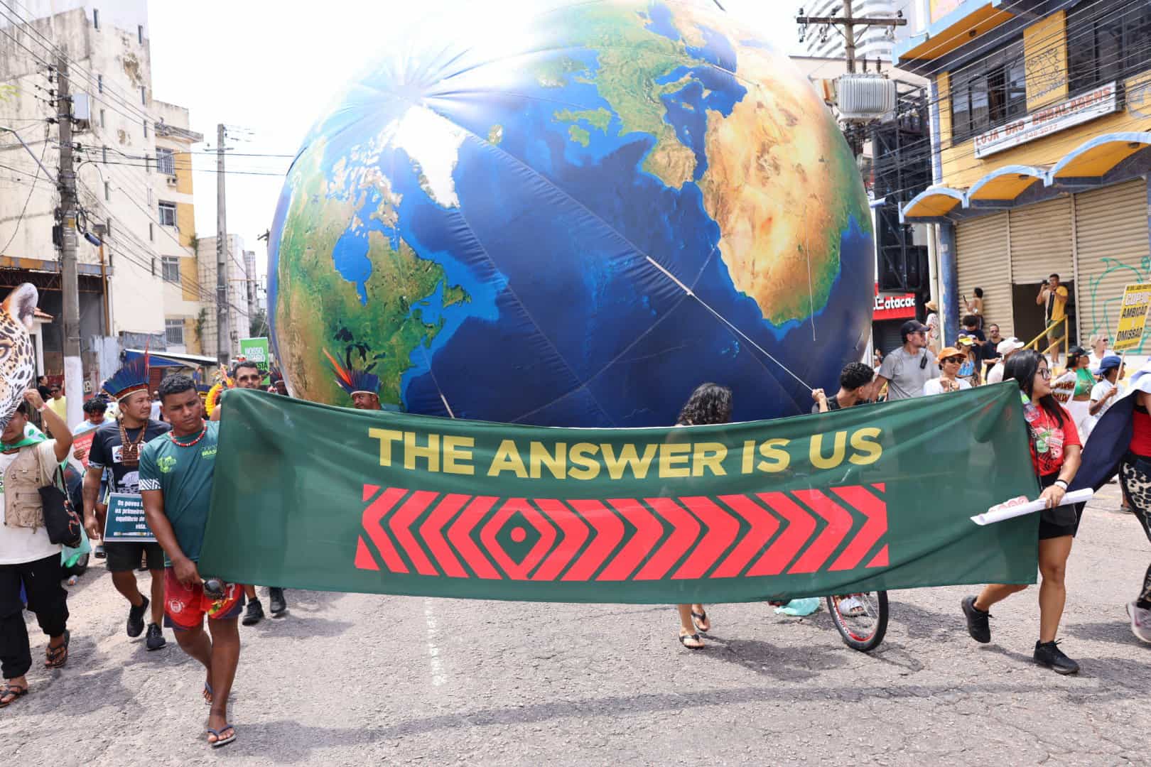 The march featured indigenous communities from across the Amazon and the world, various civil society organisations, and movement art pieces such as giant coffins representing coal, oil and gas, large suns and wind turbines, over 80 jaguar performers, a 30-metre serpent and more than 100 artists — symbolised the beginning of the end of the fossil fuel era.