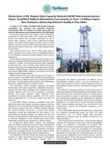 Telikom Limited CEO Amos Tepi remarked, “Mt. Kegum is Planning, Finance, and Treasury, at the site of the recently restored Mt. Kegum HCN tower.