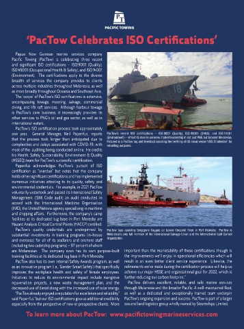 one year. General Manager, Neil Papenfus, reports PacTow’s recent ISO certifications – ISO:9001 (Quality), ISO:45001 (OH&S), and ISO:14001